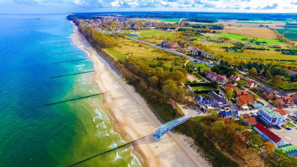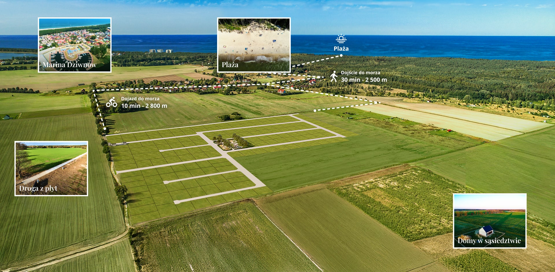 Wokół nie brakuje punktów, które budują potencjał turystyczny i wygodę wyjazdów. Centrum Dziwnówka jest w odległości 3 km, port w Dziwnowie 10 km (około 10 minut), a marina w Kamieniu Pomorskim 9 km (około 15 minut). Molo w Międzyzdrojach znajduje się 30 km od inwestycji (około 30 minut), lotnisko Szczecin-Goleniów 60 km (około 50 minut), a Świnoujście 50 km (około 1 h 20 min). Dla osób planujących dalsze trasy przydatne są też odległości: Berlin 240 km (około 2 h 40 min), Poznań 260 km (około 3 h 40 min), Wrocław 470 km (około 5 h), Łódź 530 km (około 5 h 30 min), Warszawa 630 km (około 6 h 30 min) i Kraków 720 km (około 7 h).